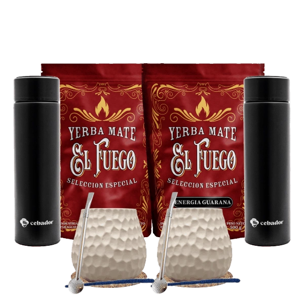 Coffret Yerba Maté pour deux : El Fuego 2x500g + 2x Thermos LED + 2x Calebasse + 2x Bombilla
