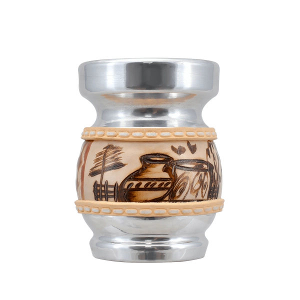 « Salvador » est un récipient pouvant contenir environ 150 ml de maté. Il était fait de bois de palo santo et revêtu de métal. Bursera graveolens (de l’espagnol arbre sacre) pousse en Amérique du Sud et est célèbre pour sécréter une résine avec une belle odeur naturelle. L’infusion préparée en calebasse de palo santo aura donc un arôme unique. La construction solide du récipient le rend résistant aux dommages mécaniques et fait qu’il maintient bien la température.