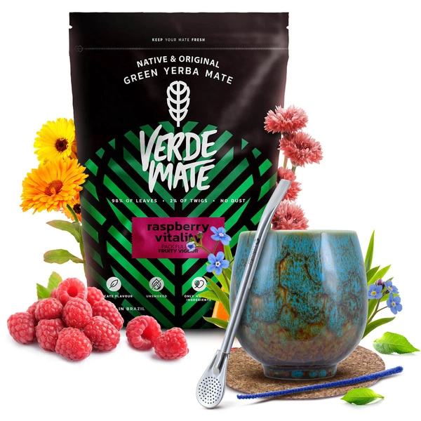 Yerba Maté ensemble Verde Mate Raspberry 500g Calebasse + Bombilla