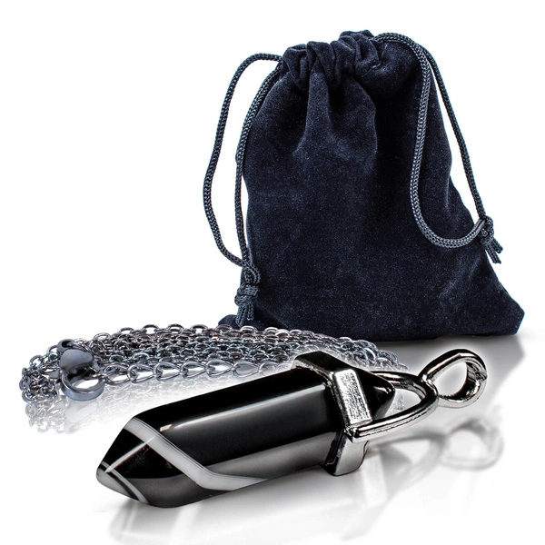 Forme: agate noire polie en monture métallique (avec chaîne), emballée dans un sachet noir