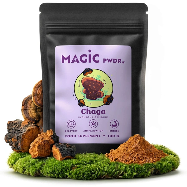 Le chaga (Inonotus obliquus) est un champignon arborescent utilisé dans les systèmes alimentaires traditionnels des pays nordiques. Dans Magic Pwdr Chaga, un extrait concentré 10:1 des corps fructifères a été utilisé, ce qui signifie une forte concentration de matière première dans chaque portion de poudre.