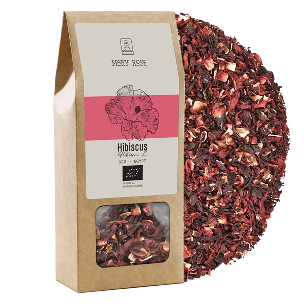 L'hibiscus est une plante exotique originaire d'Afrique et d'Asie, qui présente de nombreuses propriétés bénéfiques pour la santé. En raison de son goût acidulé, le fruit séché est utilisé dans des mélanges avec des thés et des herbes aromatiques. L'hibiscus de la marque Mary Rose est issu d'une plantation biologique et est certifié biologique. La plus haute qualité garantie !
