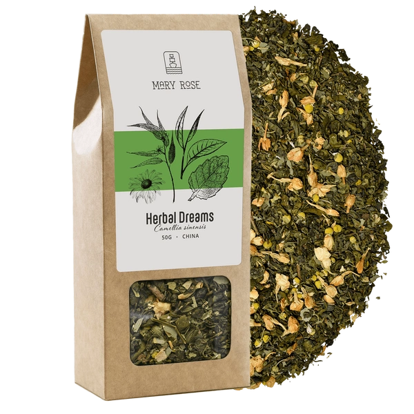 L’ingrédient principal du Mary Rose Herbal Dreams est le thé vert Gunpowder qui est parfaitement combiné avec des additifs à base d’herbes aromatiques tels que : la mélisse, la camomille, le jasmin et les feuilles d'eucalyptus et de basilic. La saveur caractéristique des herbes est harmonisée par les arômes naturels. Malgré l’abondance de divers ajouts, l’ensemble crée une composition extrêmement cohérente et harmonieuse.
