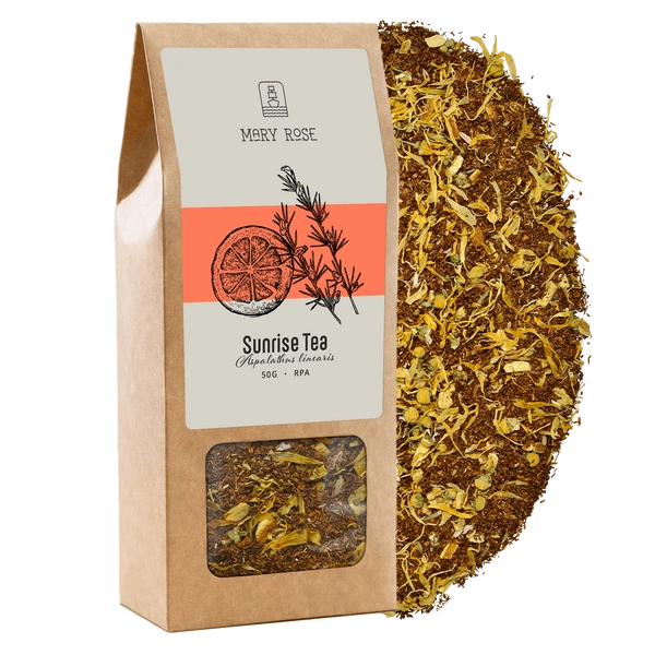 - Mary Rose Rooibos Sunrise combine les notes délicates et miellées du rooibos et des additifs tels que l’écorce d’orange, le gingembre, les pétales de souci, la camomille et le fenouil.
